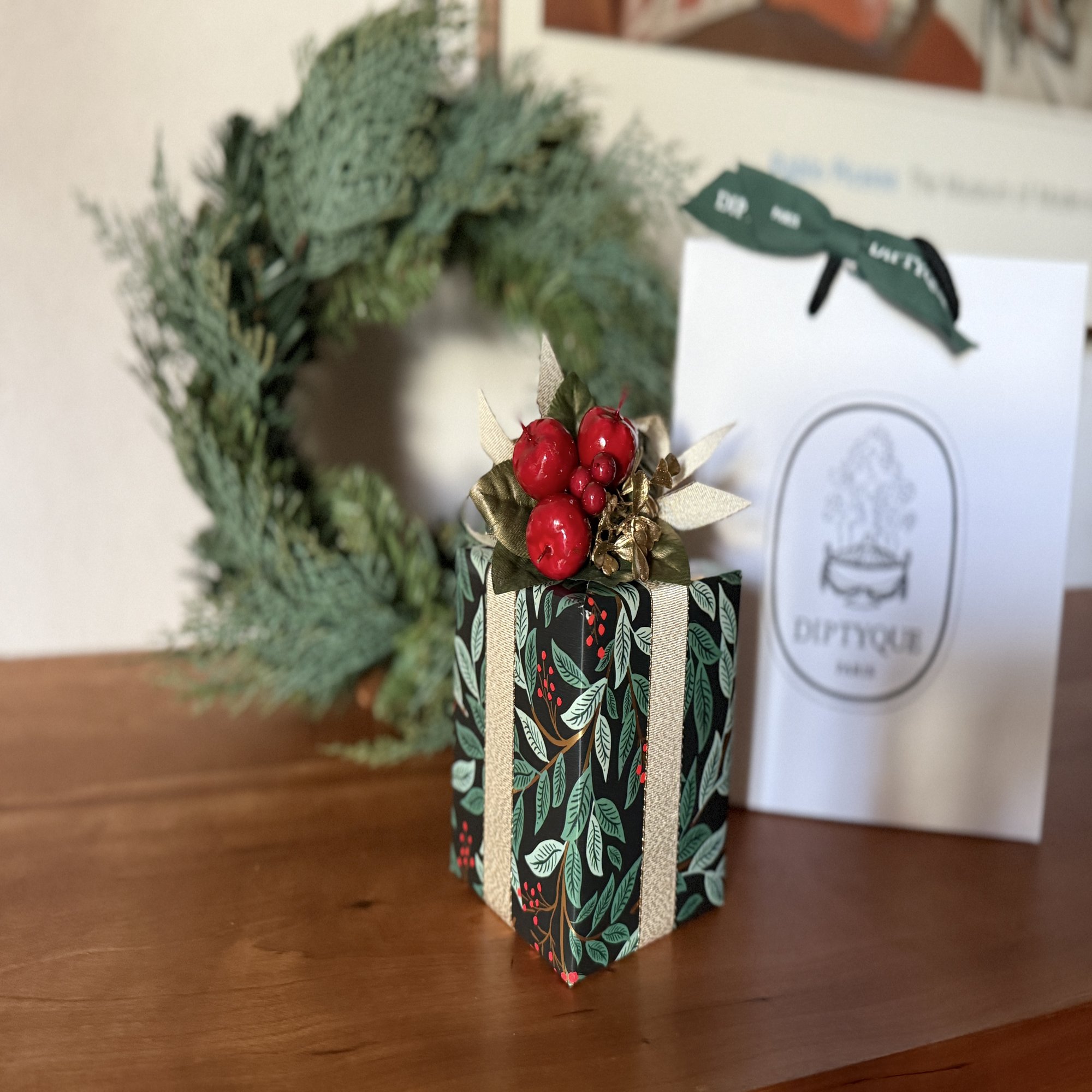 「赤い実のオーナメントを合わせると、包装紙の柄とリンクしてより一体感が出ますよ」