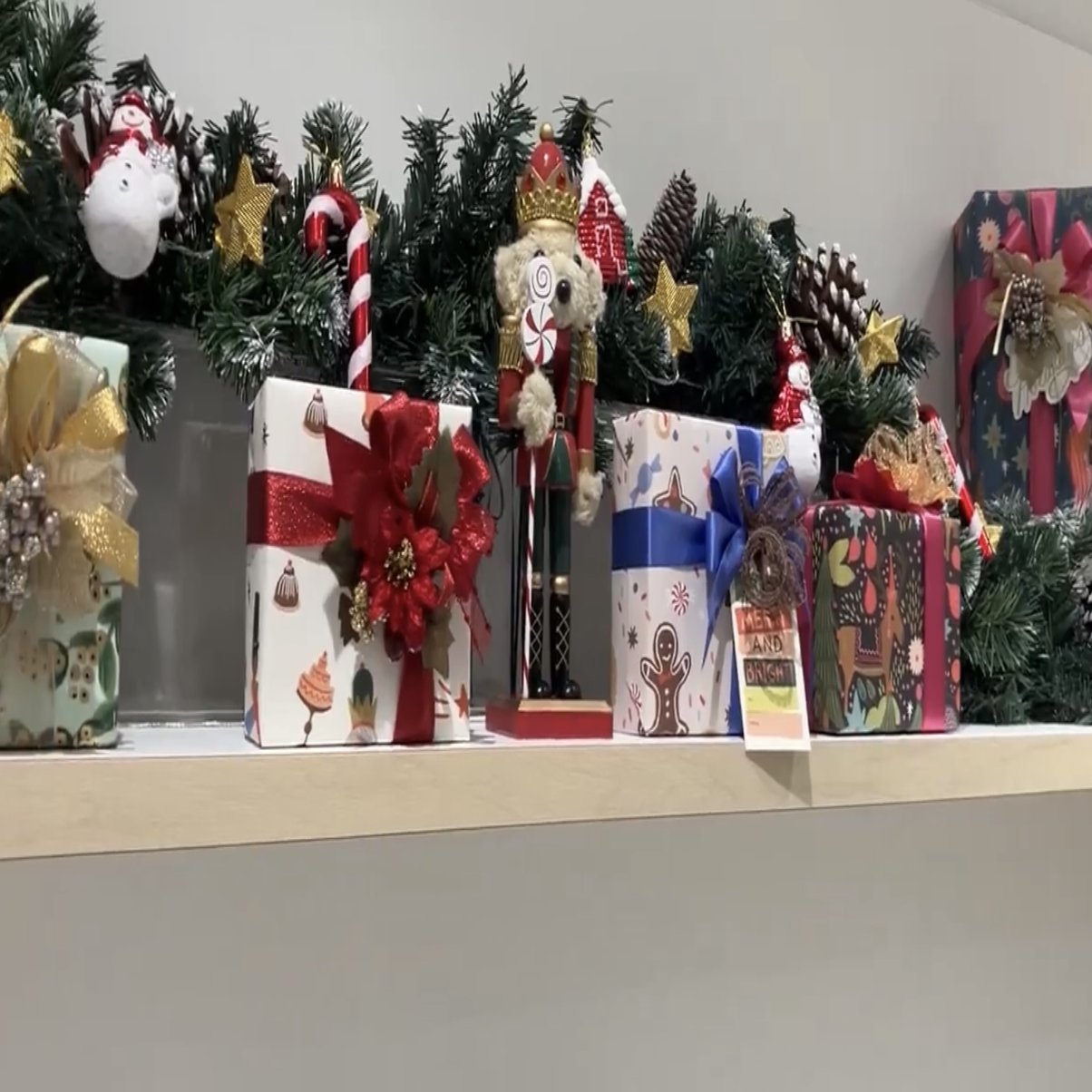 棚いっぱいにクリスマスラッピングが並んでいて、